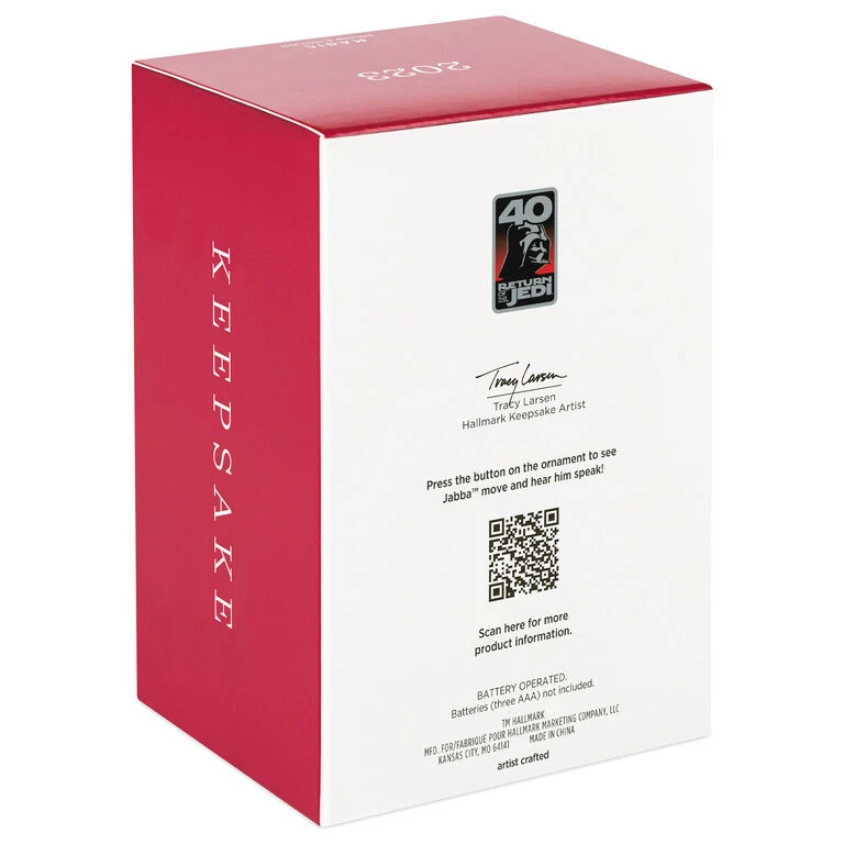 One of the galaxy’s most powerful gangsters, Jabba the Hutt, captivated the imaginations of Star Wars fans in 1983’s Return of the Jedi. Relive the magic of the movie’s practical effects with this captivating Christmas tree ornament that features the vengeful slug-like alien on his dais, complete with his pet Kowakian monkey-lizard, Salacious B. Crumb. Press the button to experience animatronic motion as Jabba delivers original dialogue from the film (battery-operated).